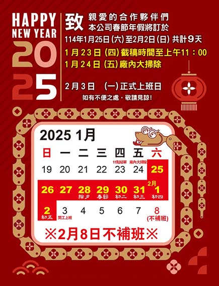 親愛的客戶您好,休假公告1月25號(六)~2月2號(日)連休9天